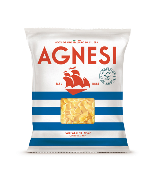 AGNESI(アネージ)は、小麦の「風味」、パスタの「食感」など、原料・製法にこだわりを持つ、イタリアの歴史あるパスタメーカーです。 AGNESIの『ファルファリーネ』は100%イタリア産デュラム小麦を使用。 小さな蝶の形のパスタは、スープやサラダの具材におすすめです。
