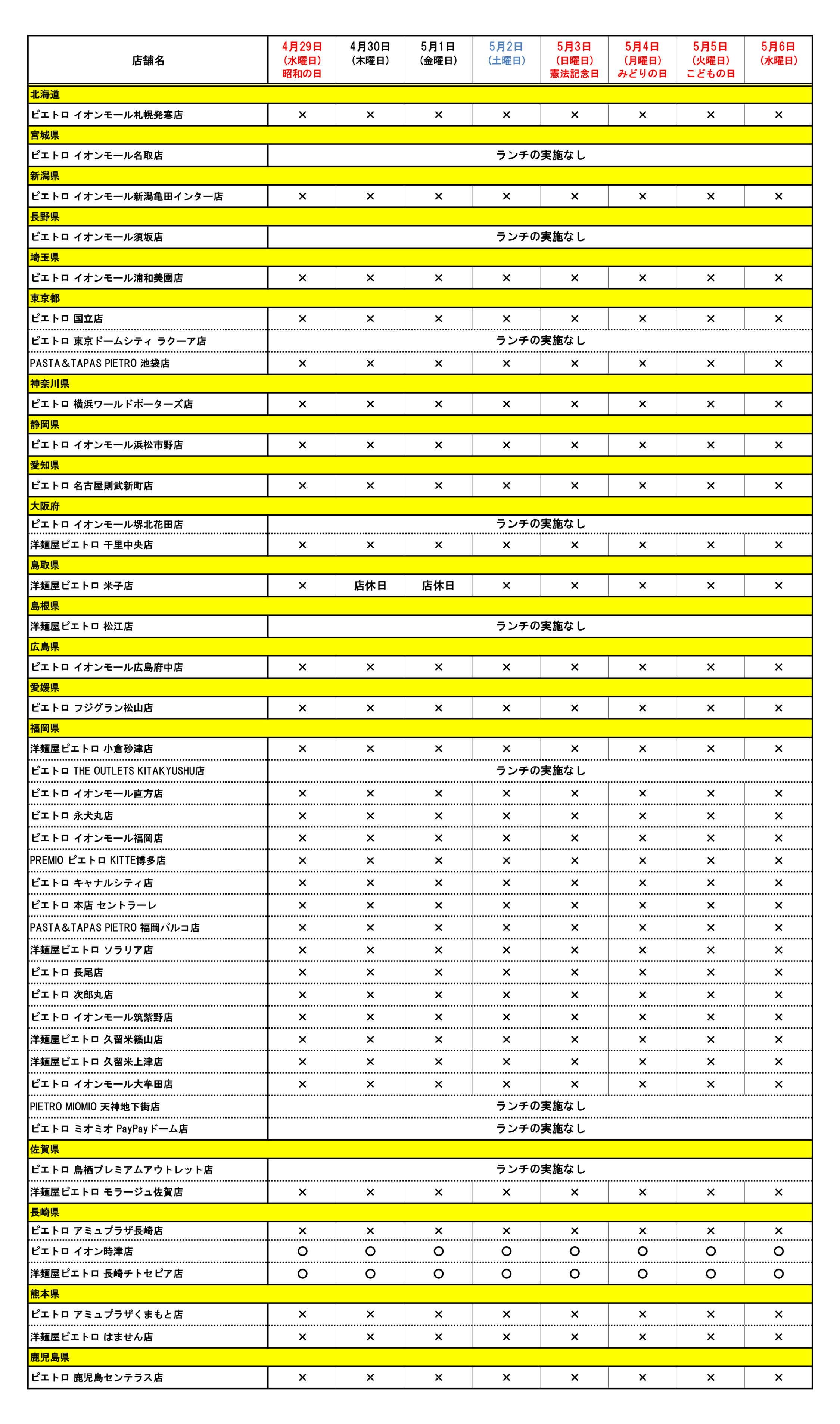 【表詳細】○:通常営業 ×:ランチメニューの実施なし(店舗は営業)