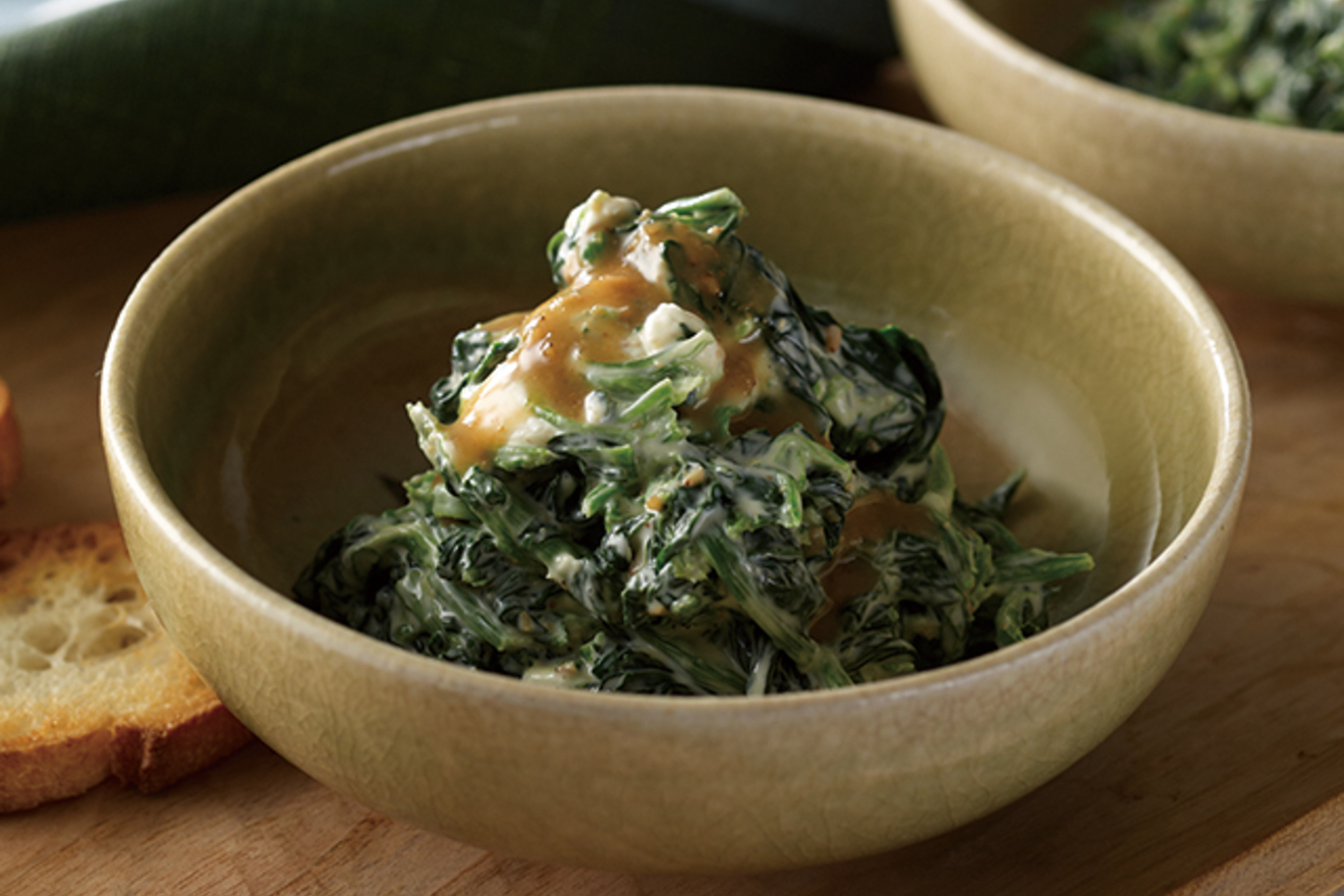 バランスの良い食感を活かすなら、「クリームチーズで白和え」がおすすめです。茹でたほうれん草にクリームチーズとピエトロドレッシング 焙煎香りごまを混ぜ合わせるだけ。約20分で完成し、ごまの甘みとチーズの組み合わせが絶妙な一品です。前菜としてはもちろん、トーストしたバゲットにトッピングすればおつまみとしても楽しめます。
