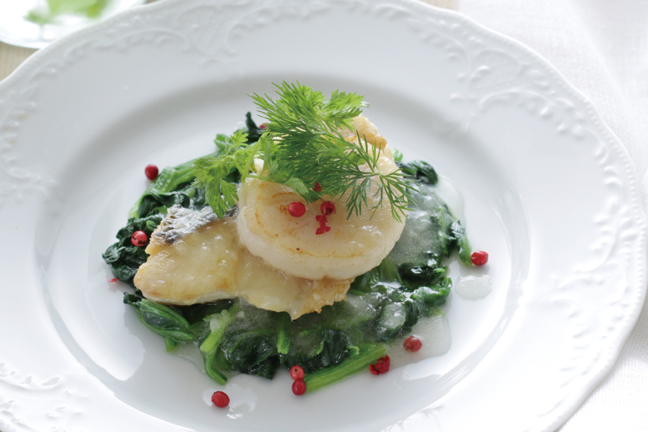 ほうれん草をやわらかく茹でるなら、「白身魚とほたてのグリル」がおすすめです。茹でたほうれん草をバターで味付けし、その上に香ばしく焼いた白身魚とほたてをのせ、ピエトロドレッシング プレミアムフレンチをかけるだけ。見た目も華やかな一品です。