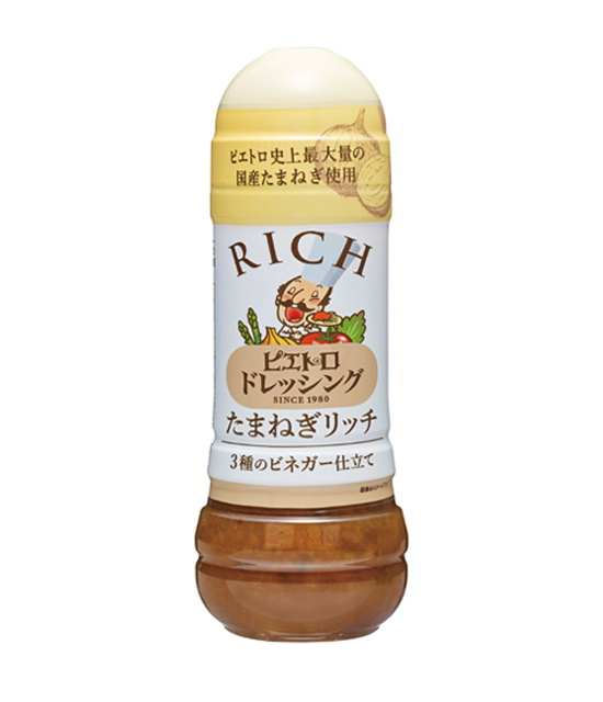 ピエトロ史上最大量※の国産たまねぎを使用した贅沢な味わいのドレッシングです。たまねぎの「ざくざく」とした食感をお楽しみいただけるよう、これまでにない大きなサイズの粗みじん切りにしたたまねぎを、たっぷり使用しています。さらに、米酢、りんご酢、黒酢の3種類のビネガーをブレンドし、まろやかな酸味と豊かな香りがたまねぎの旨みを引き立てる、「たまねぎ」を主役にしたドレッシングに仕上げました。ひと口目から、ビネガー特有のさわやかな余韻が残るリッチな味わいが広がります。味・食感・具材感にこだわり、贅沢な味わいを追求した「リッチシリーズ」は、サラダだけではなく、肉料理、魚介料理のソースとしてもおすすめです。