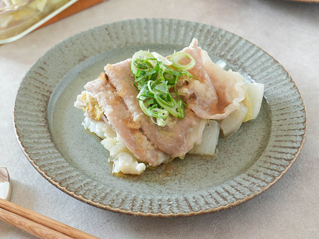 白菜、チーズ、トマト、ハムの順で、最後が白菜になるように層に重ね電子レンジで加熱する(目安:500W 3分)。 |