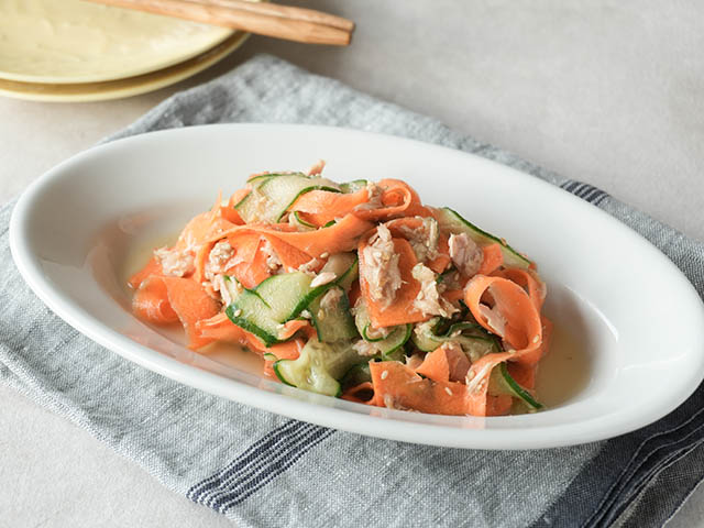 ②にドレッシング大さじ3を加え、混ぜ合わせる。器に盛りつけ、お好みでドレッシング(仕上げ用)をかけ、小口切にした小ねぎ、糸唐辛子をのせる。 |